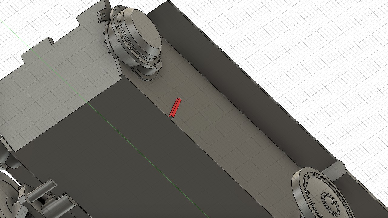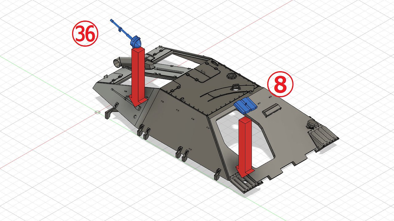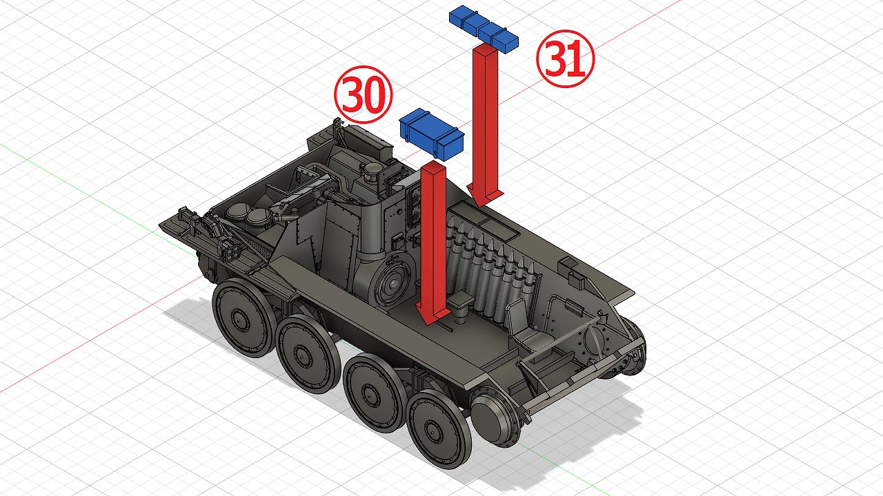 砲弾ラックは車体のガイド(赤い部分)に合わせて接着します。The the Shell rack (front) & Shell rack (rear) are glued in line with the guides (red part) on the body.
