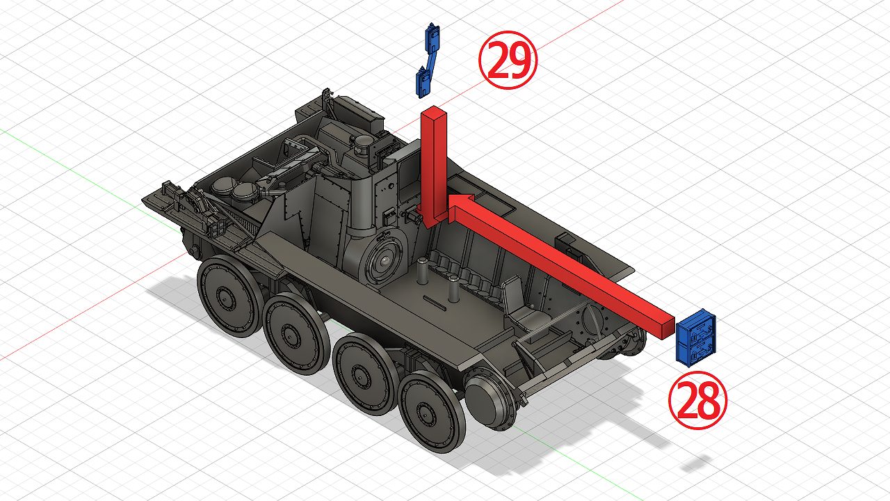 転輪は車体のガイド(赤い部分)に合わせて接着します。The wheels are glued in line with the guides (red part) on the body.