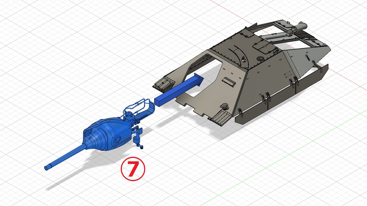 主砲は90度傾けた状態で車体の穴通します。その後主砲を回転させ、照準器を車体の穴に合わせます。破損しやすいので丁寧に作業を行ってください。主砲は接着しません。