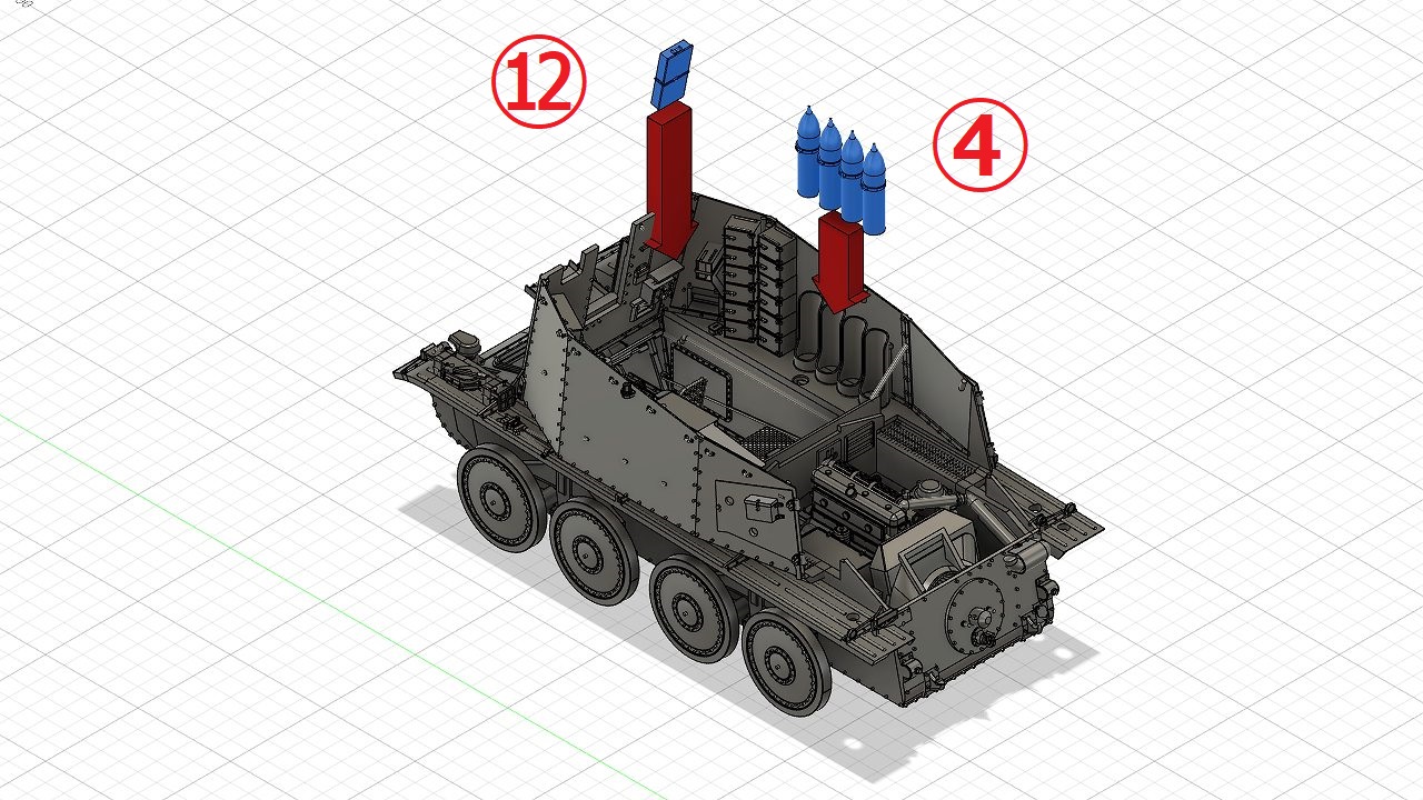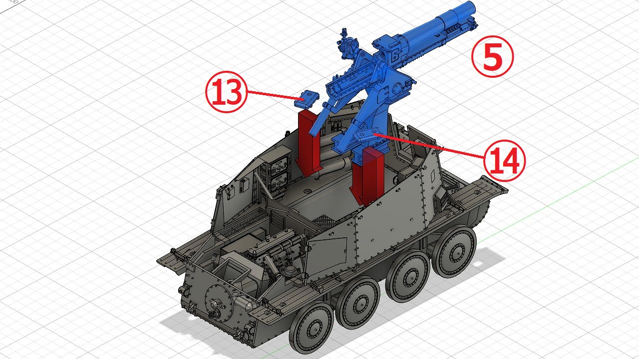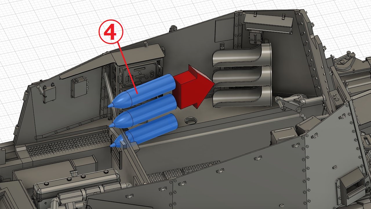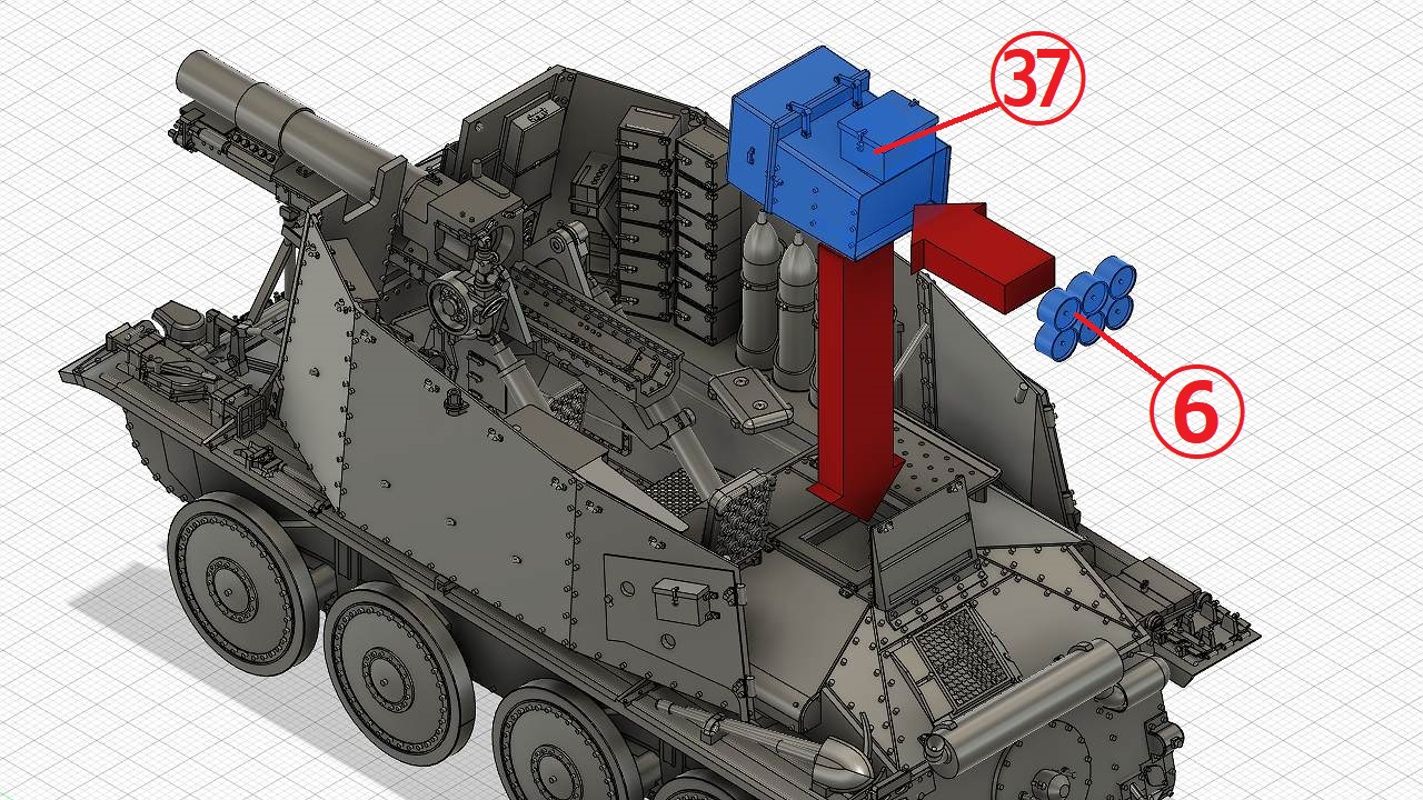 上の砲弾は、下の砲弾より後ろに位置しています。以下のパーツには上下がありますので、取り付けの際に注意してください。