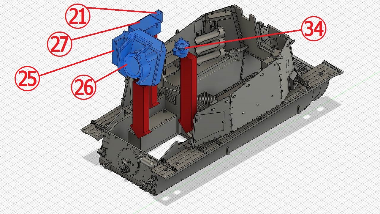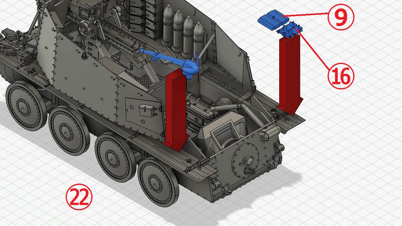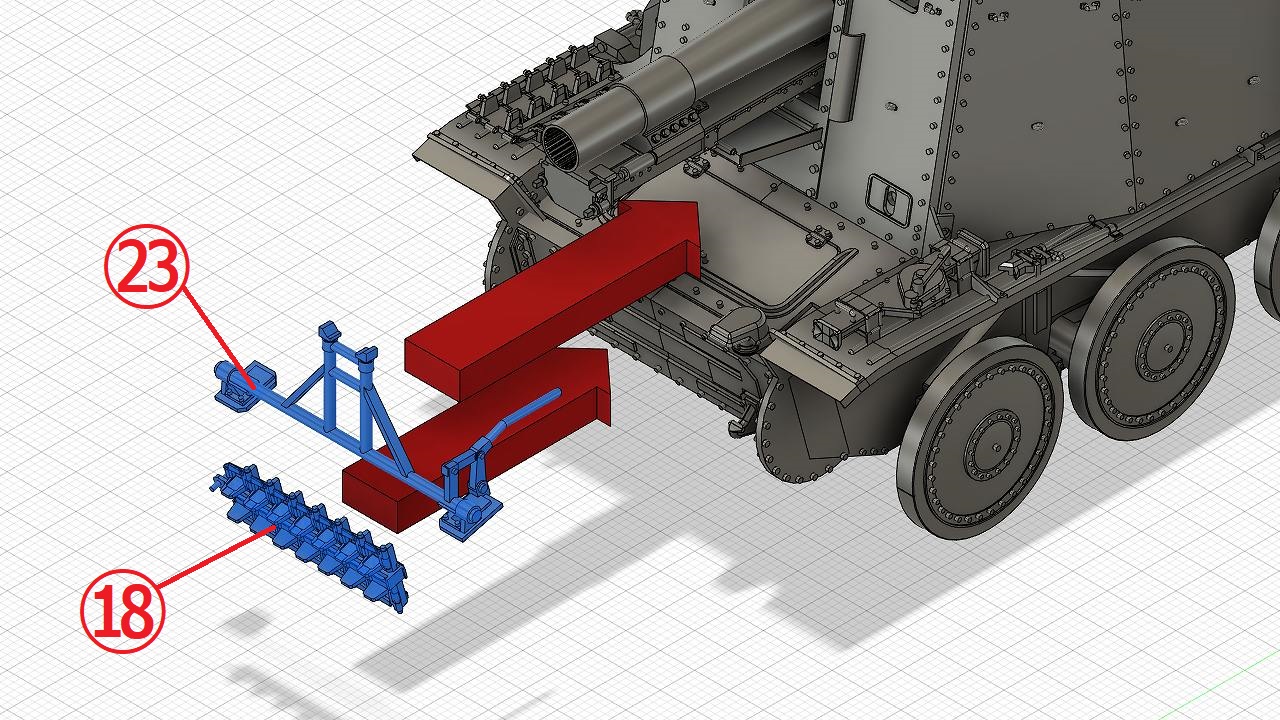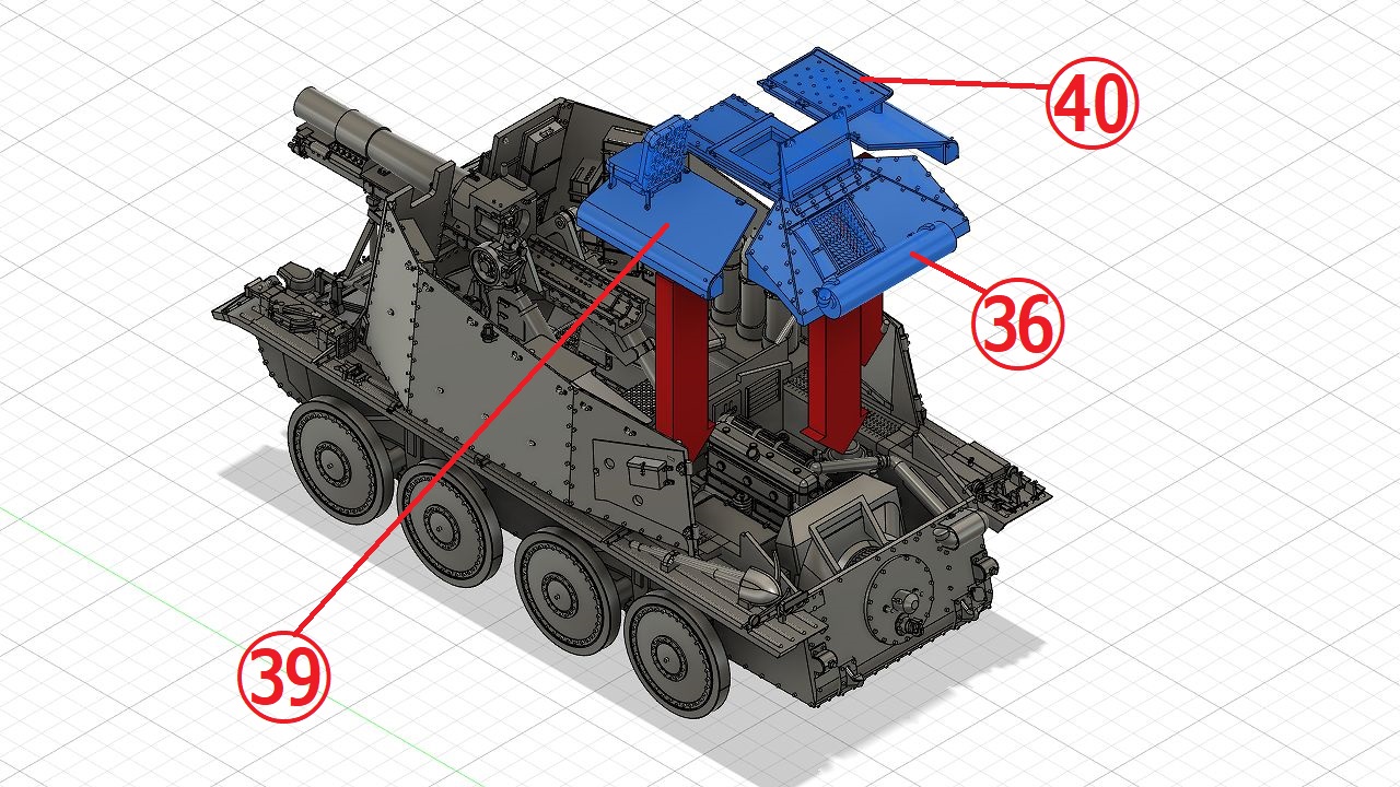 上の砲弾は、下の砲弾より後ろに位置しています。以下のパーツには上下がありますので、取り付けの際に注意してください。