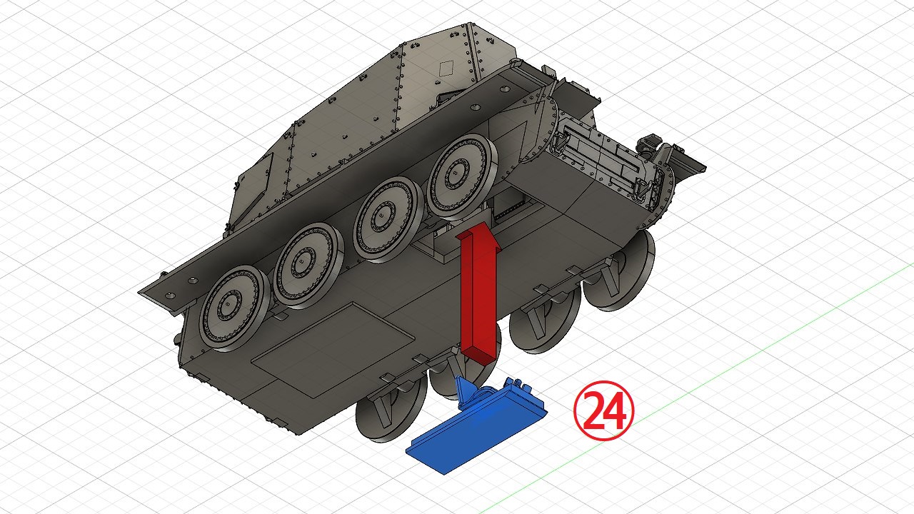 転輪は車体のガイド(赤い部分)に合わせて接着します。The wheels are glued in line with the guides (red part) on the body.