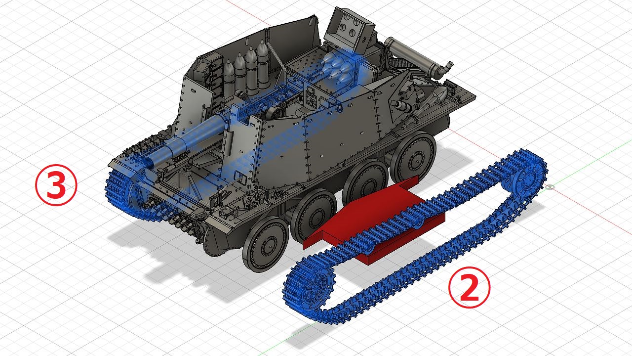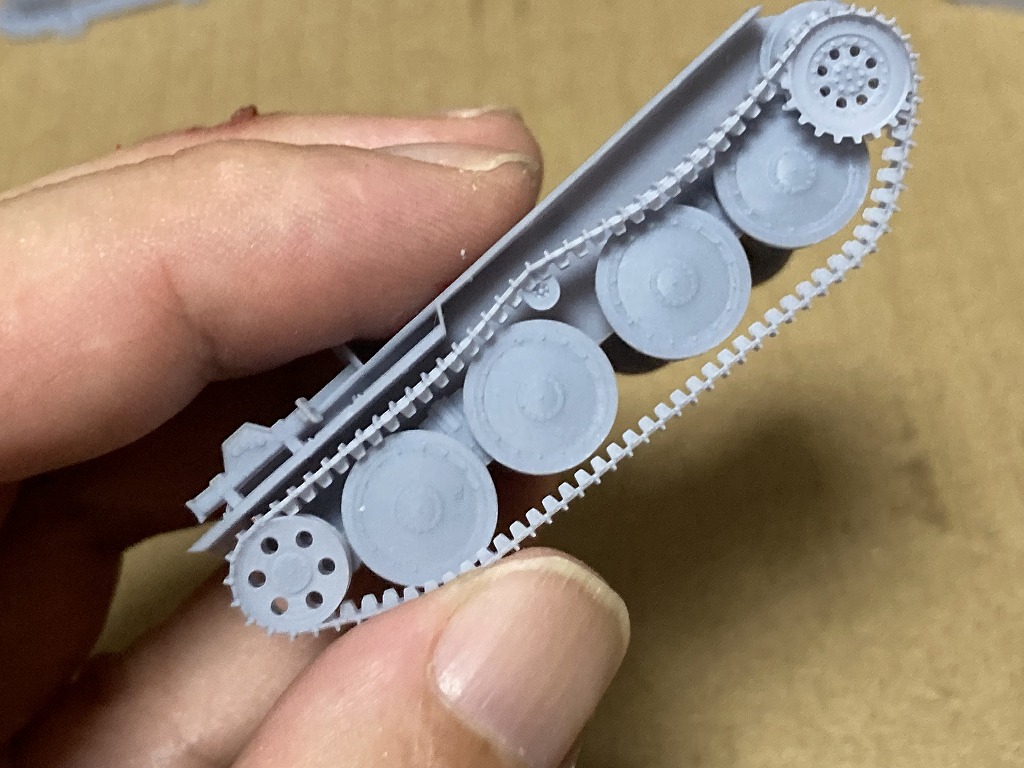 グリレHは履帯が細いため、1/72に縮小した本キットにおいてとても破損しやすいパーツです。また、転輪と遊動輪、起動輪が重なっているため取り付けにはコツが必要です。