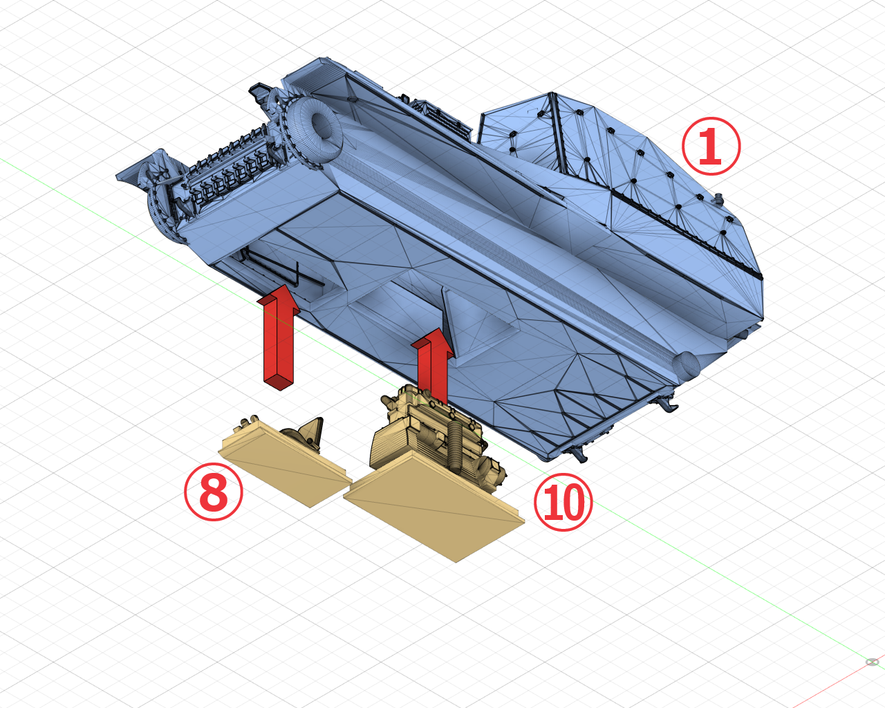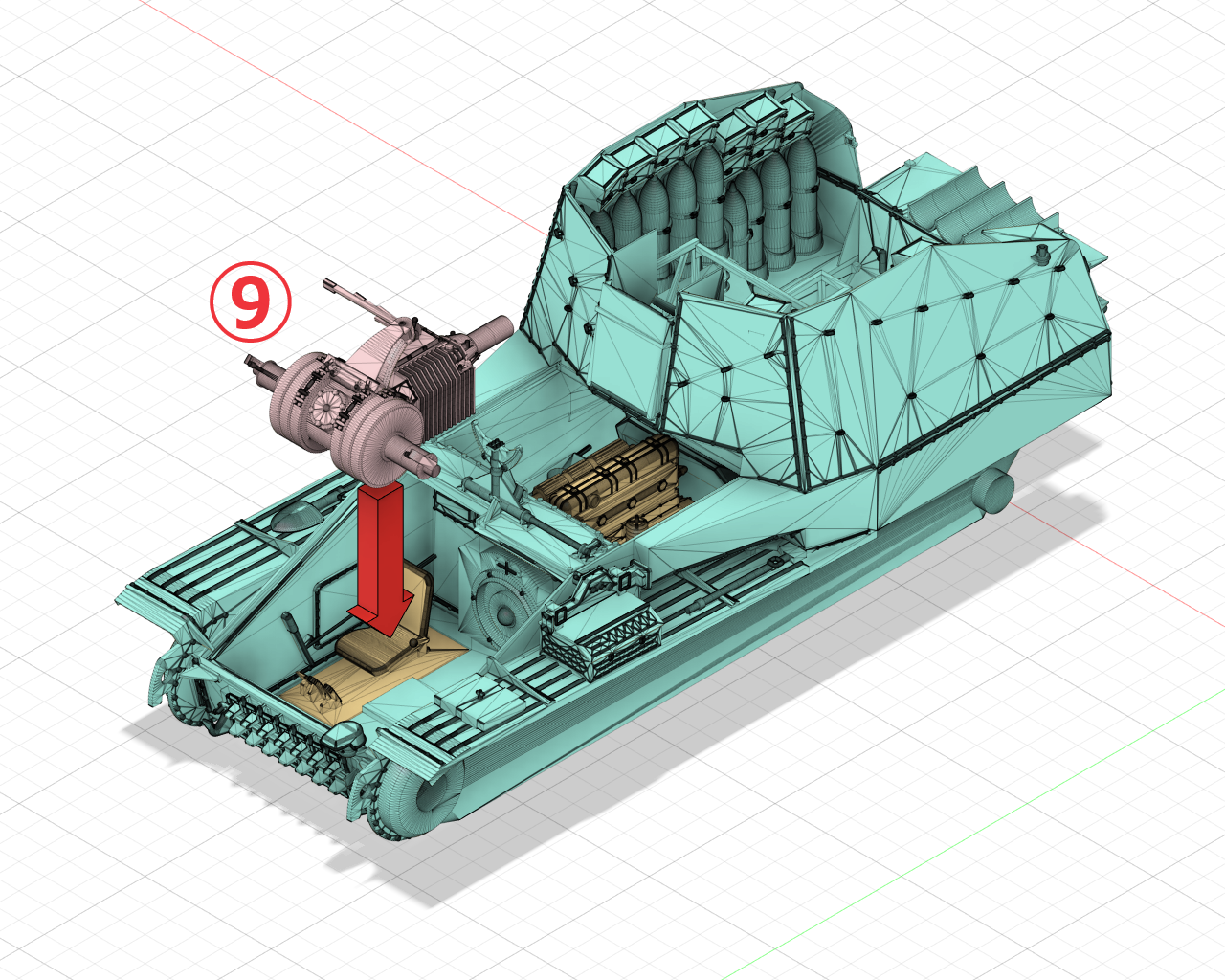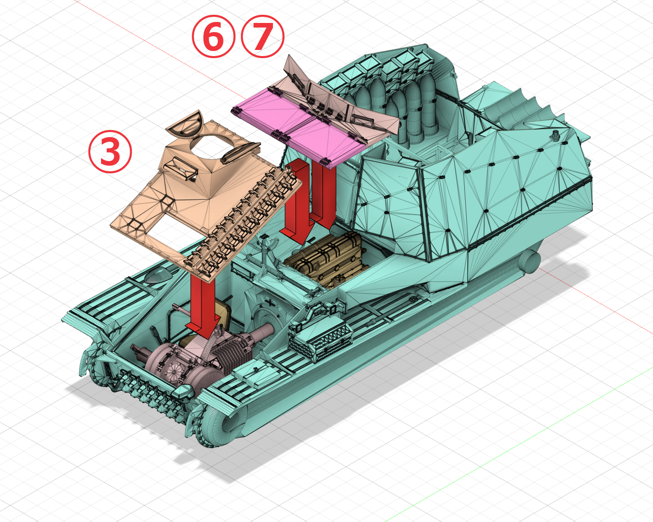 ⑥⑦エンジンルームハッチは主砲覆いを避けるように、横から滑り込ませます。