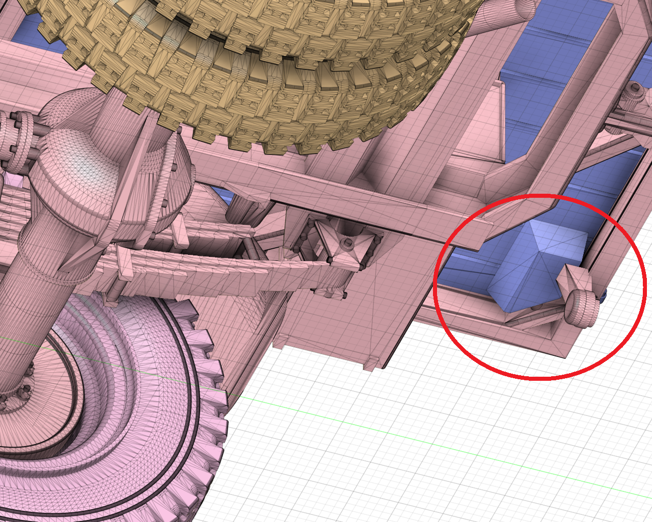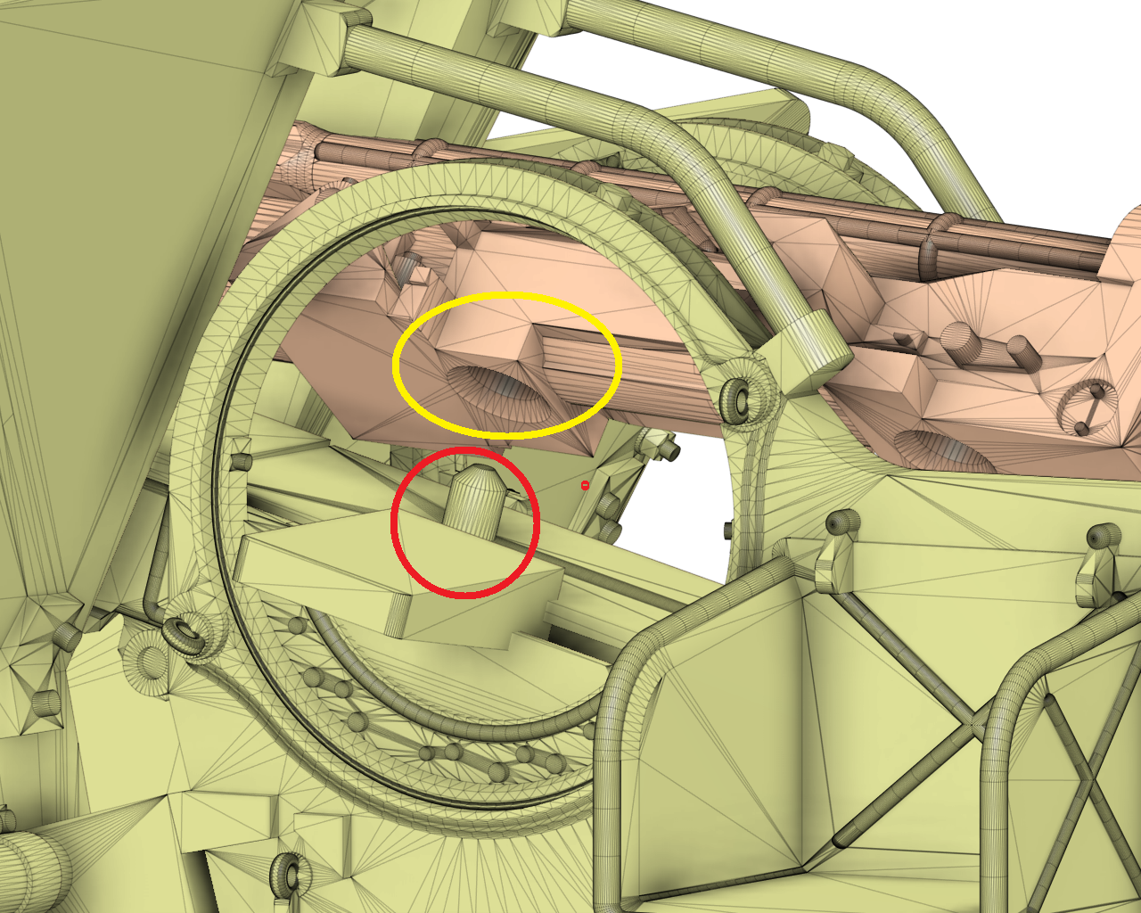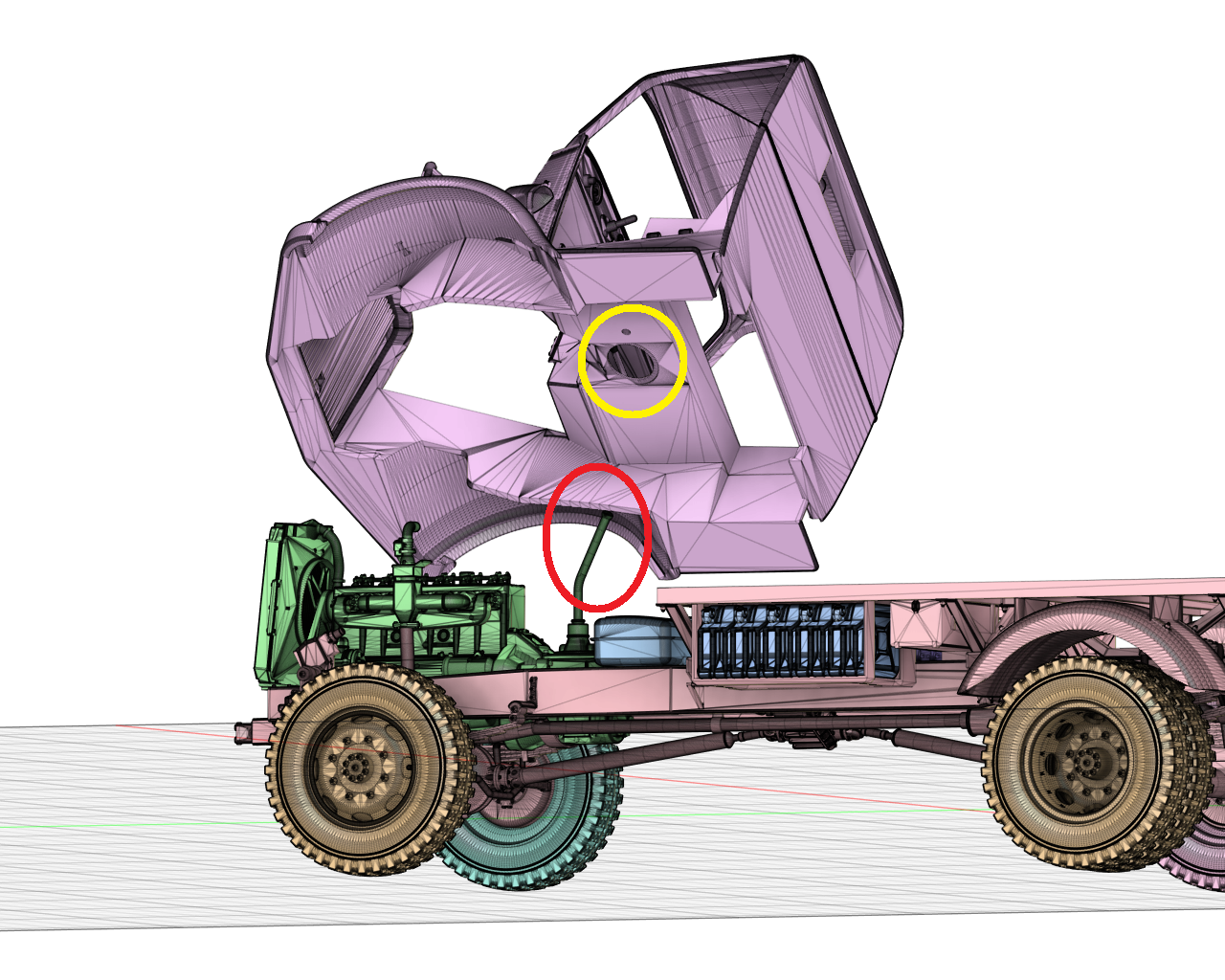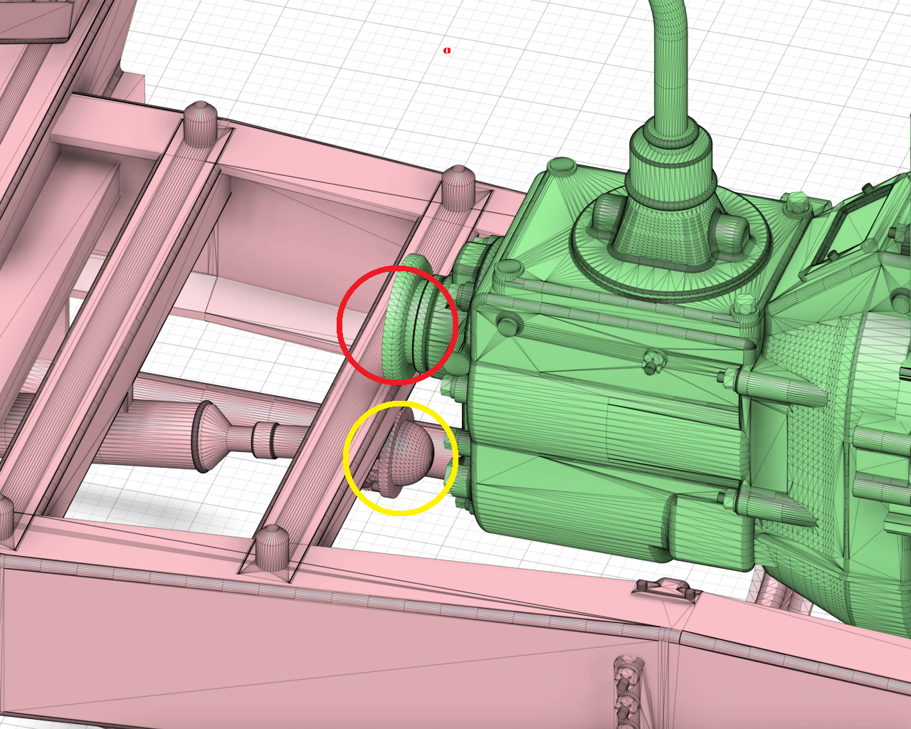 Install the front part of the engine by aligning the pin circled in red with the hole circled in yellow.