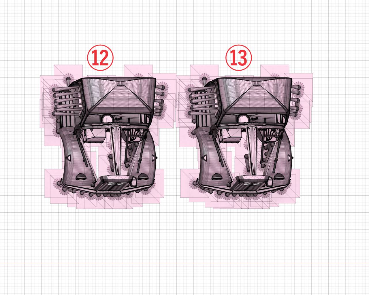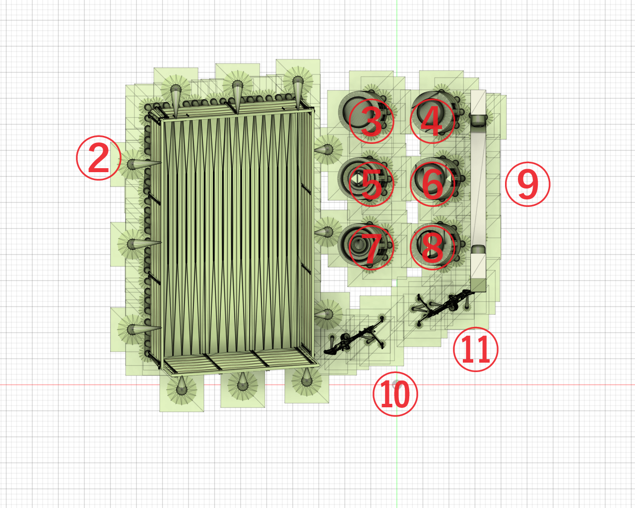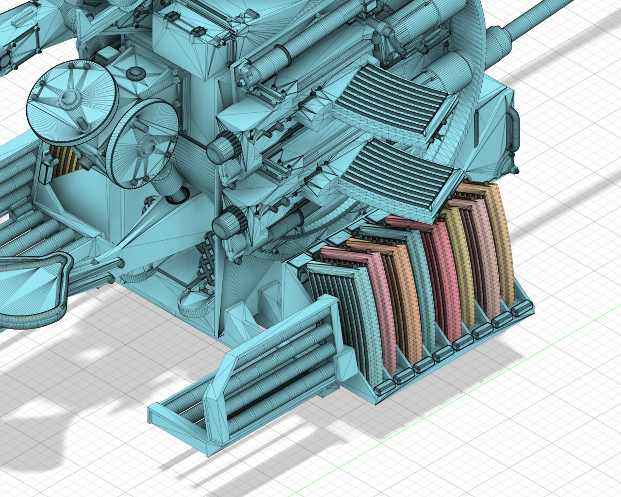 弾倉を左右に取り付けます。左右合計で16個取り付ける場合と、1つ飛ばしに8個取り付ける場合があったようです。以下の図は16個取り付けた場合の例です。