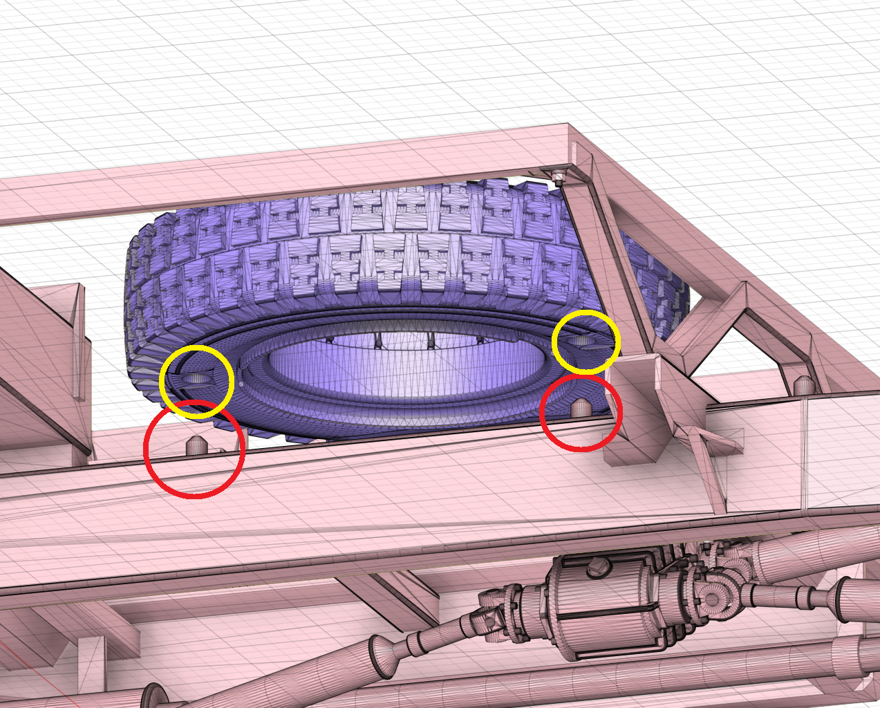 Install the spare wheel by aligning the pins circled in red with the holes circled in yellow.