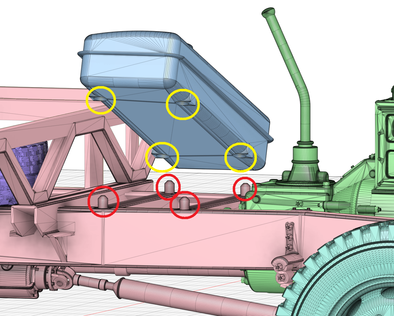 Install the fuel tank by aligning the pin circled in red with the hole circled in yellow.