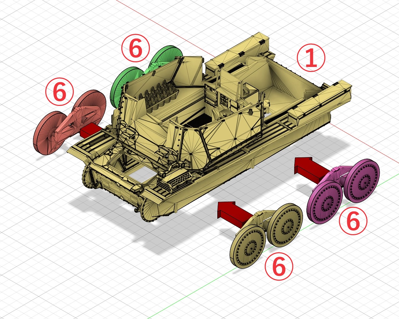転輪は車体のガイド(赤い部分)に合わせて接着します。The wheels are glued in line with the guides (red part) on the body.