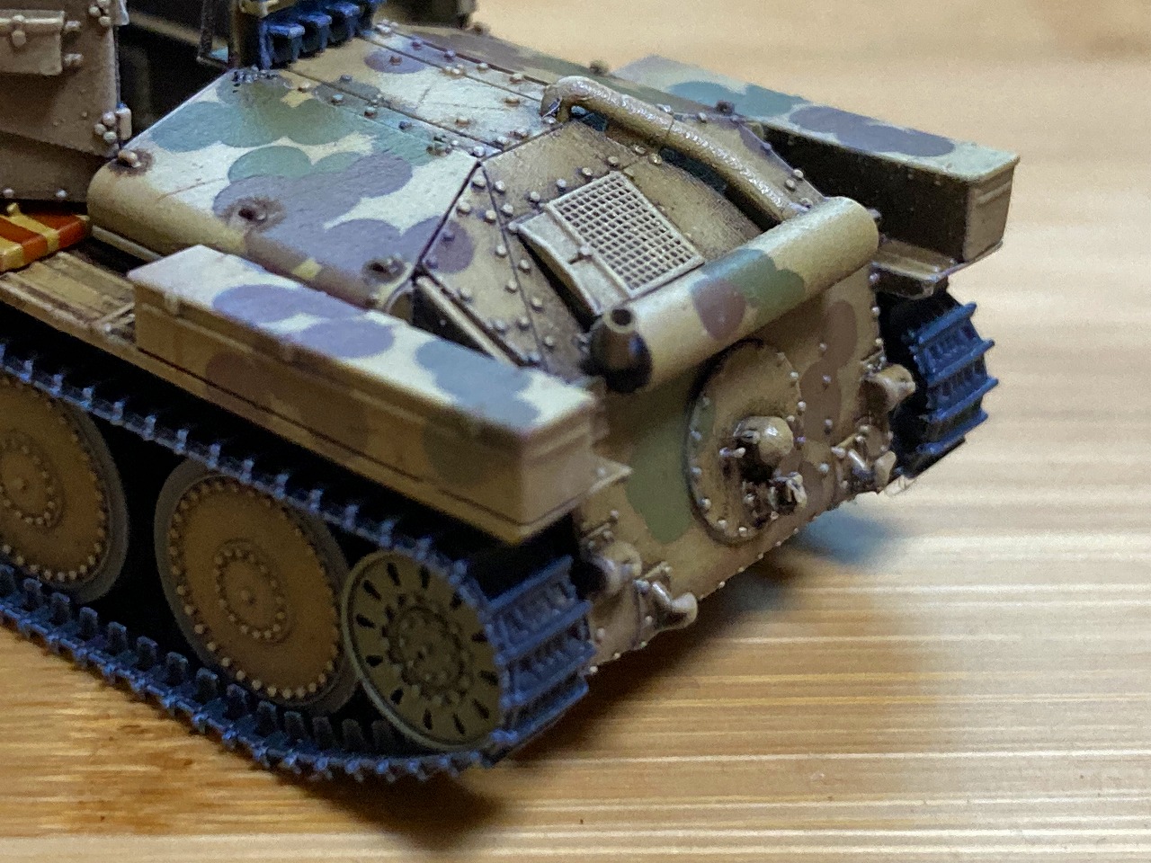 ヘッツァーや38tは履帯が細いため、1/72に縮小した本キットにおいてとても破損しやすいパーツです。また、転輪と遊動輪、起動輪が重なっているため取り付けにはコツが必要です。