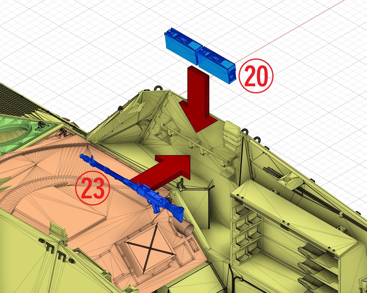 砲弾は接着しません。押し込むだけで固定されます。一度組み込むと砲弾を外すことは難しいので、頻繁な脱着はしないで済むようにしてください。