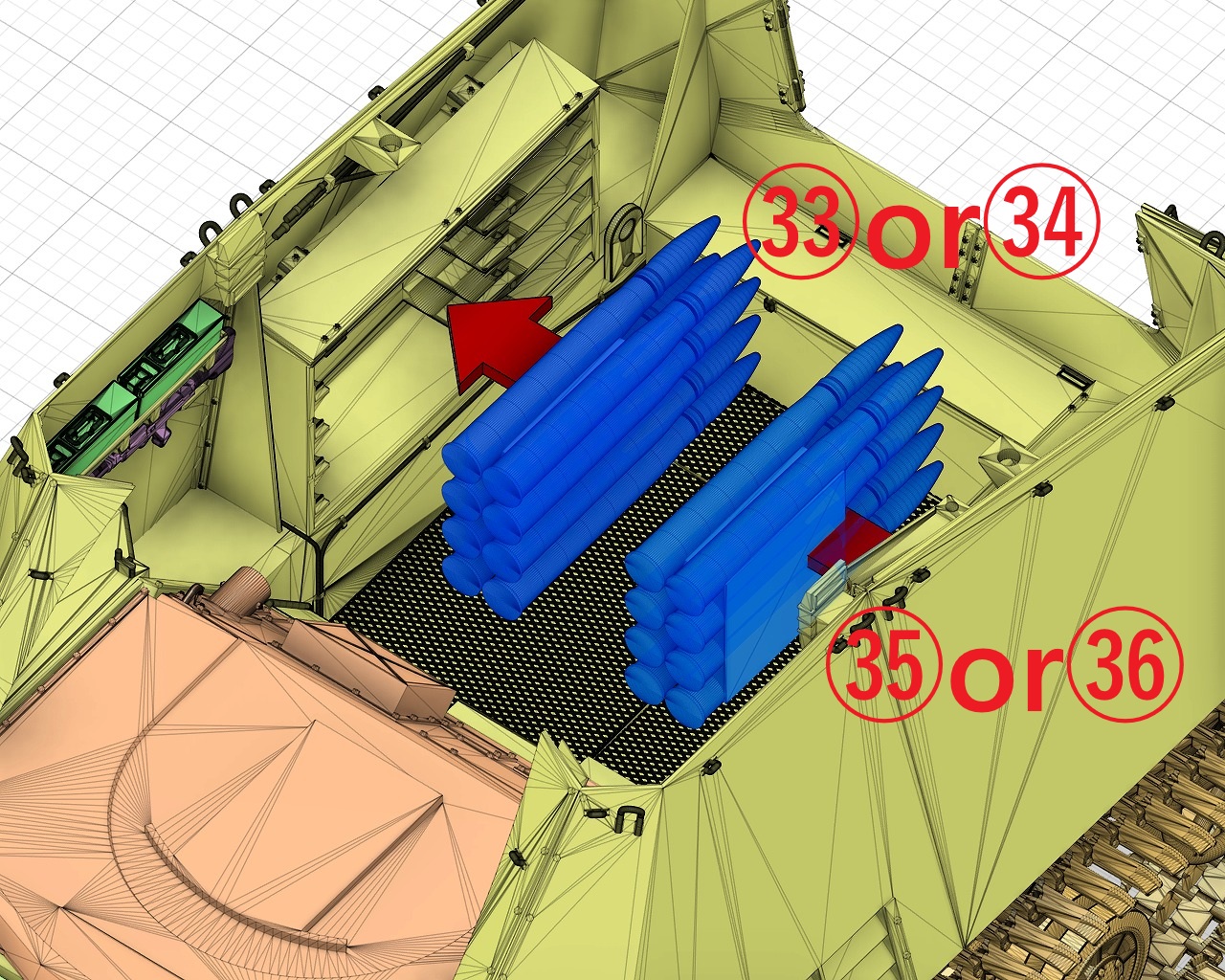 長い砲弾が榴弾、短い砲弾が徹甲弾です。