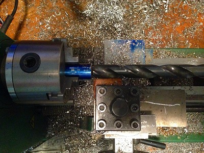 ツイストドリル(いわゆる普通のドリルですね)はその形状から(意外なことですが)ツール剛性は低いのです。旋盤の強力なトルクにより、容易にぐねぐねとたわみます。とにかくドリルは切り出しがキモ、ここをずらしてはいけないのです。そしてたいていの場合、どんなにセンター穴がびしっと開いていてもなぜか(笑)ドリルはぐねぐねとたわみ始めます。