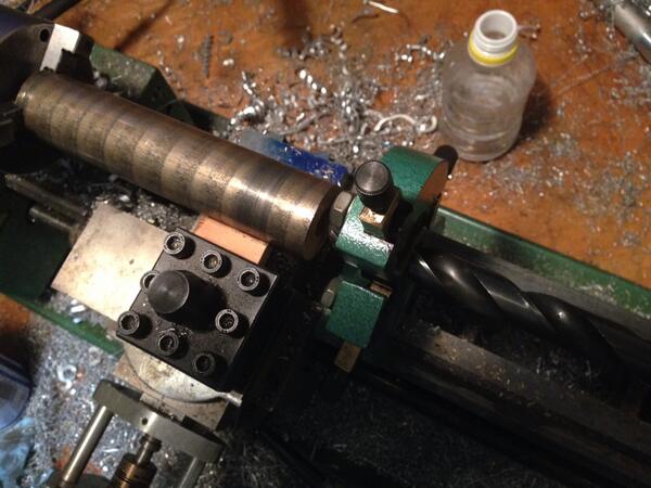 とマイクロ旋盤としてはかなり大きく重い材料です。さらに悪いことに、材料センターにすでに13mm程度の穴が開いているのですがこれがセンターからずれています。