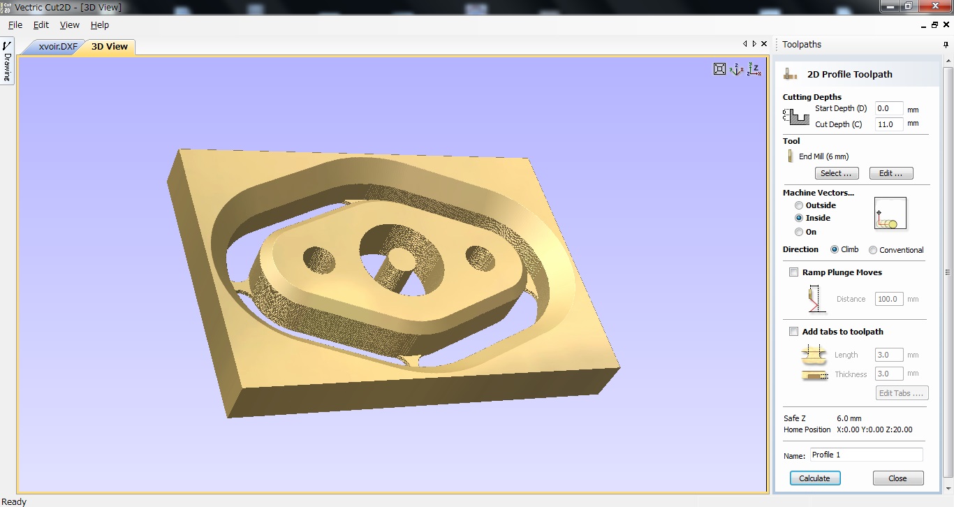 ややこしいのは「2DCAD」という名称であるわりにきっちりと立体物を加工できるということです。2DCADって2Dなんだから紙とかみたいにペラペラなものしか設計できないんじゃないの?10mmとか厚みのある板材の部品を設計するときに2DCADは使えるの?という疑問を持たれるかもしれませんが(私だけ?)、大丈夫、2DCADで厚みのある板材を設計できますし、CNCで削るときも2DCADで書いた図面を使用することができます。