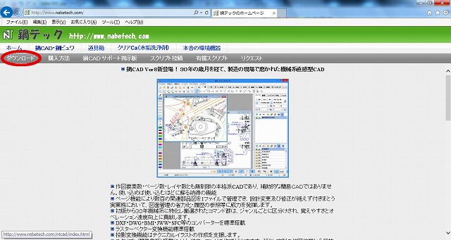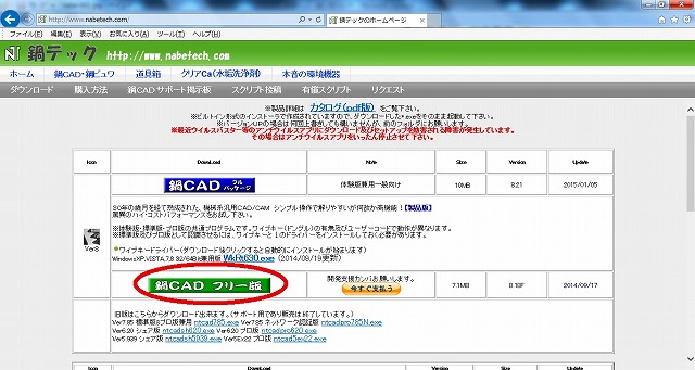 をダウンロードすることができます。今回は先に説明した通りフリー版を使用させて頂きますので、画面中央の「鍋CAD フリー版」をクリックします。