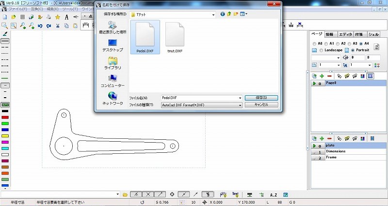 それでは、この図面を次工程でCAM(Cut2D)に取り込むために、DXFファイルで保存します。