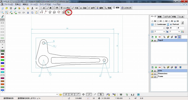 材料のサイズも書いておきましょうか、忘れてた(笑)「Dimensions」レイヤーを開いて・・・おおっと、ペダル図形をトラップ移動させるときに「Dimensions」レイヤーを表示させるのを忘れてたので、せっかく書いた穴寸法が取り残されてちゃいました。