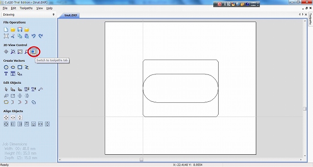 左側のパネルが閉じ、右側に「Switch to toolpaths tab」が表示されます。この画面で、ツールパスを作るのです。