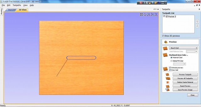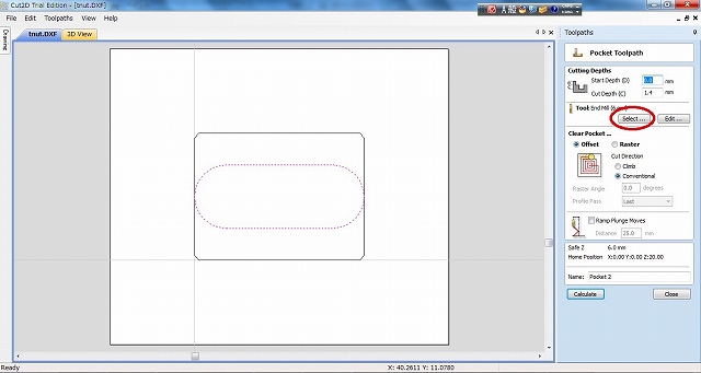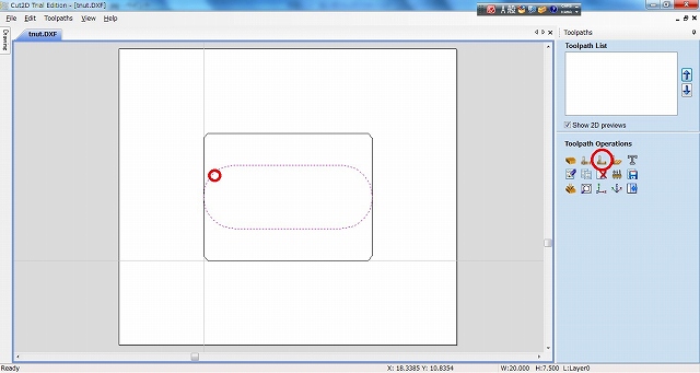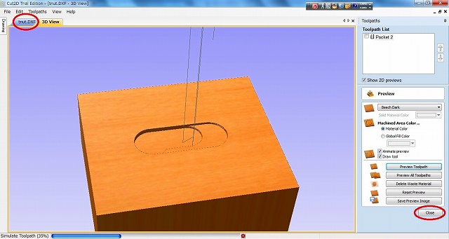 シミュレーションをじっくり見て気がすんだら(笑)、右下の「Close」、そして左上の「tnut.dxf」をクリックして次のツールパス作成に入ります。