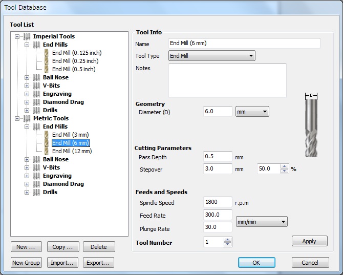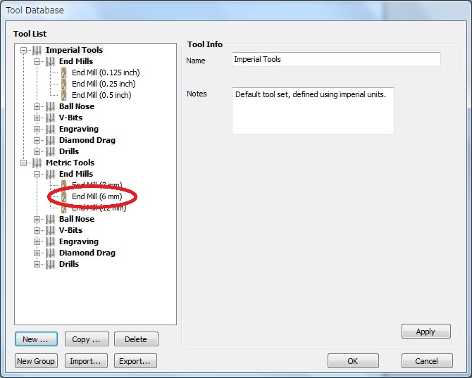ダイアログ左から、ツールを選択します。ここでは、(筆者が愛用している)6mmのスクエアエンドミルを選択します。すると。