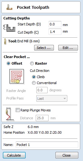 その場合は「calculate」をクリックした後にその右の「close」をクリックします。ひとつ前の画面に戻りますから、その画面で「preview Toolpath」アイコンをクリックしてください。