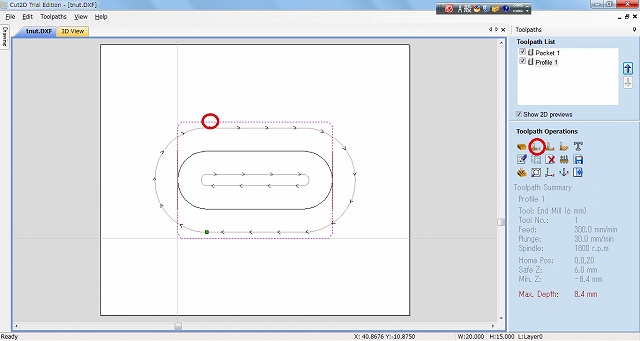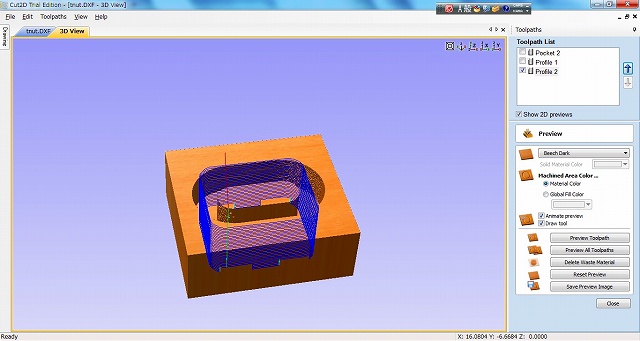その場合は「calculate」をクリックした後にその右の「close」をクリックします。ひとつ前の画面に戻りますから、その画面で「preview Toolpath」アイコンをクリックしてください。