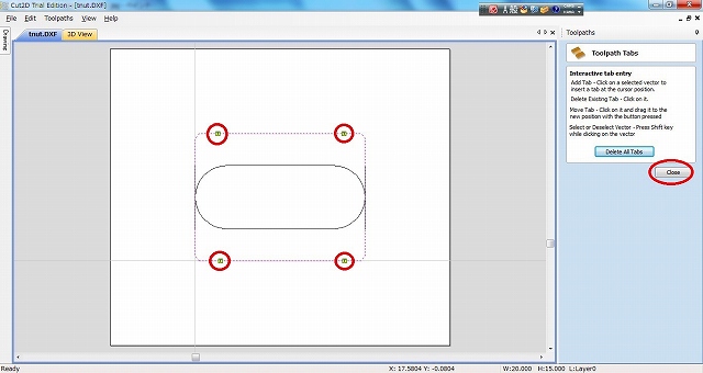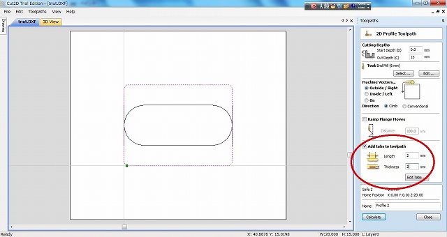 先ほどのプロフィール加工と基本的には同じ作業を行いますが、その際に「Cut2D」の便利機能、「タブ作成機能」を使用し、このTナットを「本当に加工した際」に、出来上がったTナットが吹っ飛ばないようにします。