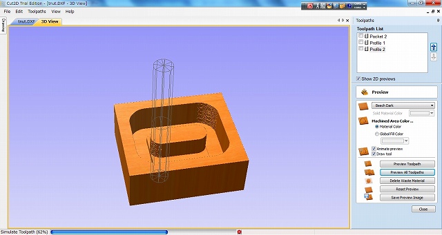 さあ、今回もシミュレーションをしてみましょう。画面右の「Preview All Toolpaths」をクリックします。