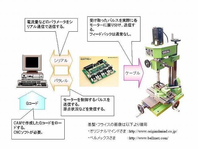 その「なにか」は我々の用途としては、当然「工作機械」であり、それはフライスであり旋盤です。とはいえ、単なるフライスや旋盤をCNCソフトウエアで制御することは当然できないわけで、正しくはCNCフライスやCNC旋盤に取り付けられた「ステッピングモータ」を制御する、というわけです。