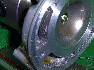 この角度では見えませんが、先ほどの燃焼室中央の穴、プラグ穴にプラグをねじ込み、それをチャックにくわえます。その後ダイヤルゲージ(私は横着して刃物台に挟んでいます)で振れを計測、プラスティックハンマーで軽く叩きながらセンターを出していきます。