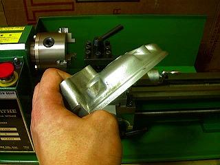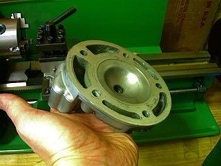 チューニングショップではフライスとフェイスカッターを使用してこの「面研」といわれる作業を行ないます。しかし私のフライス(ベルメックスのX-1)ではテーブル移動量が小さすぎ正確な切削ができません。そこで、旋盤を利用します・・・スパークプラグの穴を利用して旋盤にくわえればよいのです。