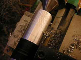 「ミニ旋盤を使いこなす本」には切削抵抗を減らすためにトップスライドを傾ける方法が紹介されていますが、相手がアルミ(しかも切削性の高い材質)の場合、そのような工夫はせず普通に正面から切り込んでも大丈夫なようです。