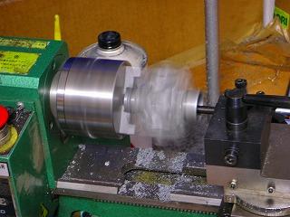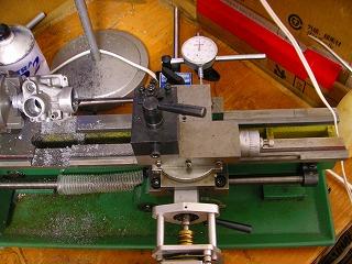 そしてわずかな切削量を制御するためにマグネットスタンドでダイヤルゲージをセット、直径方向の送りをミクロン単位で計測します。