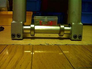 なんといっても200kg超のマシンのフロントを支える重要なパーツです。一度この状態で寸法を確認します。フロントアクスルシャフト(以降アクスルシャフト)を軸に正面向かい合って左から