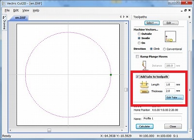 画面右下部の「Add tabs to toolpaths」にチェックを入れ、「Edit tabs」をクリックすると・・・ああ、紙面(?)が尽きた、その2へ続く!
