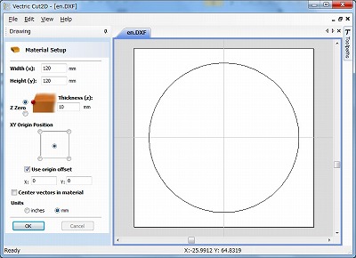 ・XY Orign Position:CADで引いた図面上の原点を、材料のどこに合わせるかを指定します。中央、材料の上下左右端に設定できます。