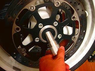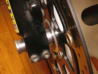 この作業は定番中の定番、アクスルシャフト径がホイール>フォークであれば、カラーを作成することで比較的容易に組合せ可能です。