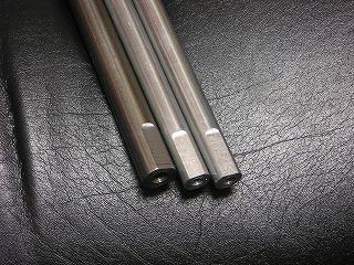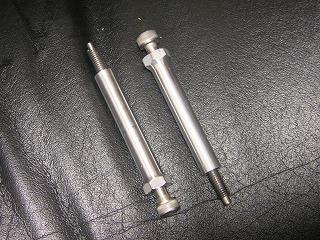 ステンレスの5mm×70mmのキャップボルトを加工したものと、対面10mmの六角棒(硬いアルミ?)を加工したもの。