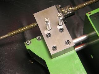 ボールねじのナットを主軸向かって左側へ移動した結果、ノーマルのカミソリ押さえボルトと位置ば重なってしまいました。これを回避するために長いナットと押さえナットを作成して、ナットホルダを貫通して(!)代替とします。やれやれ。