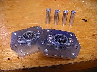 開けた穴にタップを立てて、ベアリングユニットを組み付け完成。カラーはアルミの10mm丸棒より削りだしました。 真鍮が在庫切れだったので。