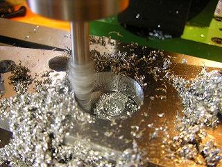 28mmともなると、さすがにドリルでは開け切れません(油圧ラジアルボール盤でもあれば話は別)。またベアリングはずれ防止のリップを残すとなるともう、CNCフライスの独壇場です。さささっとGコードを作成し・・・