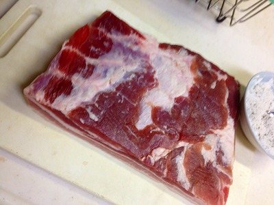 ・・・これは、ちょっと良さげな塩を使ったほうがいいかもしれません。でも、普通の塩でもいいです。どうせ「塩抜き」工程がありますから。肉の重さの1/20、用意します。