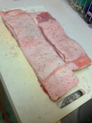 ベーコンの塩漬け工程は「肉を熟成させる」事が目的であり、「塩味をつける」ことが目的ではないのです。