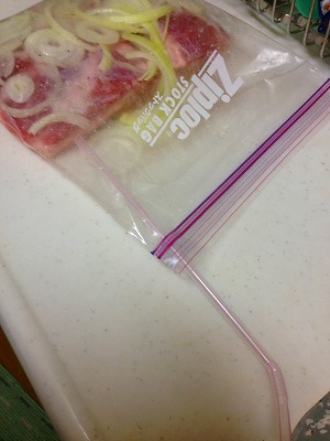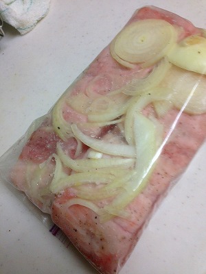赤み部分が多少黒っぽくなっているのがお判りでしょうか。袋から取り出します。スライスした玉ねぎも取り出しますが・・・こいつは利用できないでしょう、もったいないですがそのまま廃棄。焼けば食べられるのかな?そうとう塩分が多そうですが。