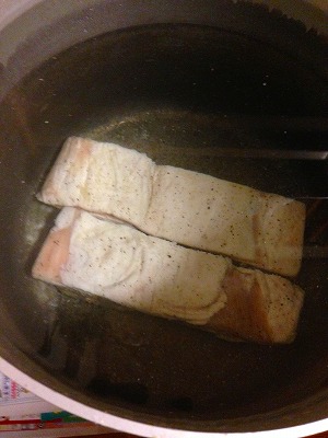 私は「水を交換する方法で」と書きましたが、12時間水につけておきます。端っこを切り取って焼いて食べてみて塩気を確認してみてもいいです、この段階で「塩が舌に触る」ようでは、塩抜きが足りません。