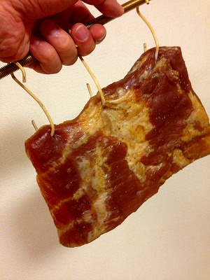 乾燥させた肉を取り出しましょう。ペーパータオルを外し、適当な針金(針金ハンガーをばらしてもいいです)でフックを作ります。