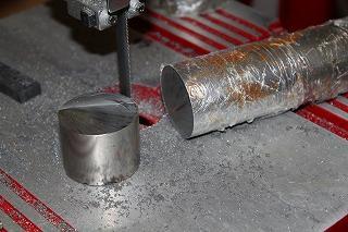 もっともいしむらさんのボーリングヘッドは私のものより一回り大きい(フライス盤本体も大きいですから)のであちこちアレンジして一回り小さくなる予定です。 加工時間短縮のため、バンドソーで指定寸法+1mm程度に切り出します。