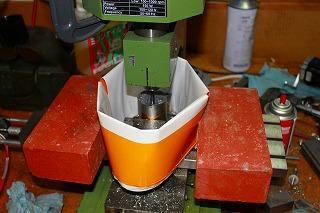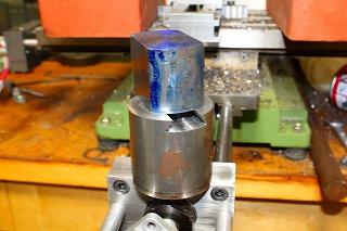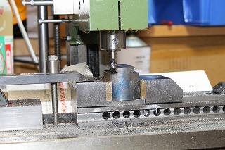 自作バイスで自作ボーリングヘッドを加え、自作フライカッターで。