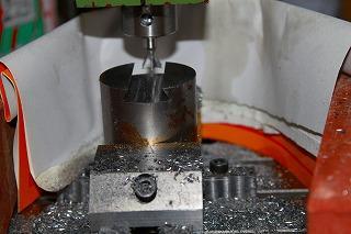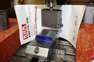 自作精密バイスに切り出した材料を銜え、8mmの超硬エンドミルで溝を切ります。